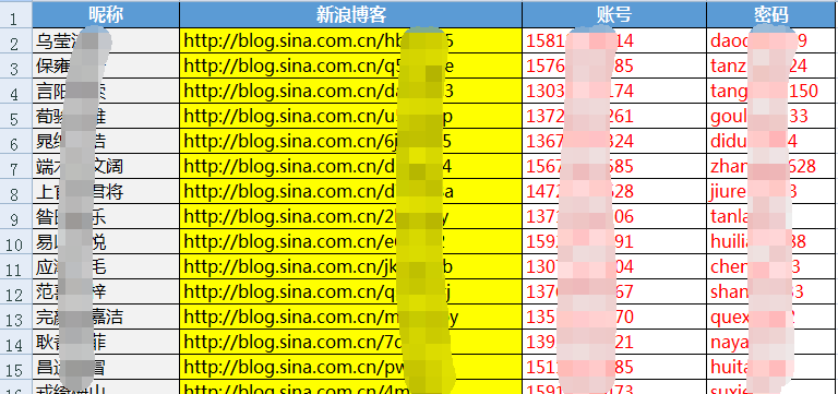 顾名思义新浪博客站群分解开来通俗点来说就是新浪博客的集群,也就是把一定数量的新浪博客聚集在一起形成一个类似于蜘蛛网式的群体。理解起来其实并没有那么难懂,但是关键是做起来,应该没有人愿意去做了。因为这需要你要有极强的耐心和持久的决心,由于新浪博客平台自身的防灌水机制的限制,所以新浪博客很难用软件来批量的做,我之前也有试过一些软件,但过一段时间都直接别封了,所以新浪博客你得自己手工一个一个注册,而且一个IP尽量不要注册超过五个。我现在新浪博客站群的数量大约在三百个左右,就光注册新浪博客账号我就花了近一个月的时间。给大家展示部分我所做的新浪博客账号情况: