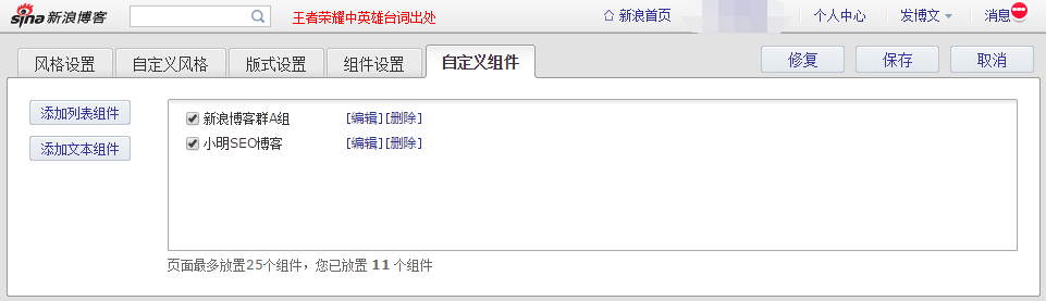 正所谓心急吃不了热豆腐,所以在养博客方面我们也不能心急,博客一般需要养30天左右的时间。做好之后接下来就是把博客如何把博客聚集起来。记住,不管做什么大的外链集群,千万别设置什么链接规律,一句话:相互链接的形式越乱越好,没错,我这里说的是越乱越好!具体的做法,我们我们把链接做成锚文本的形式,就是用上述的“昵称”作为关键词就行,然后把它们放到表格中,随机打乱,分成数量不一的不同小组。然后将这若干的新浪博客小组群随机添加一组到单个新浪博客上面,具体的步骤是:点击新浪博客页面设置,然后直接添加文本组件就可以了,如下图: